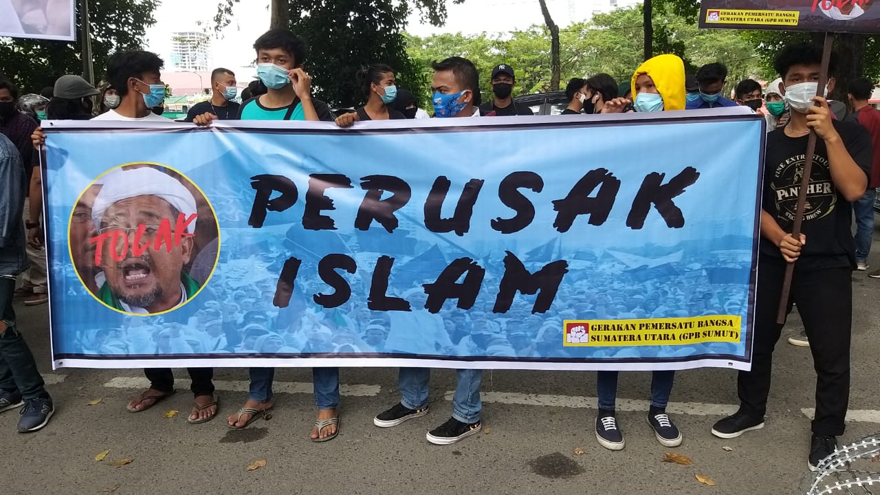 Tampak massa membawa sejumlah spanduk berisi foto HRS dan tulisan "Perusak Islam - Perusak Umat - Pemecah Belah Bangsa - Ngaku Ulama Tapi Tutur Katanya Jorok - Masyarakat Sumut Menolak Rizieq Shihab."