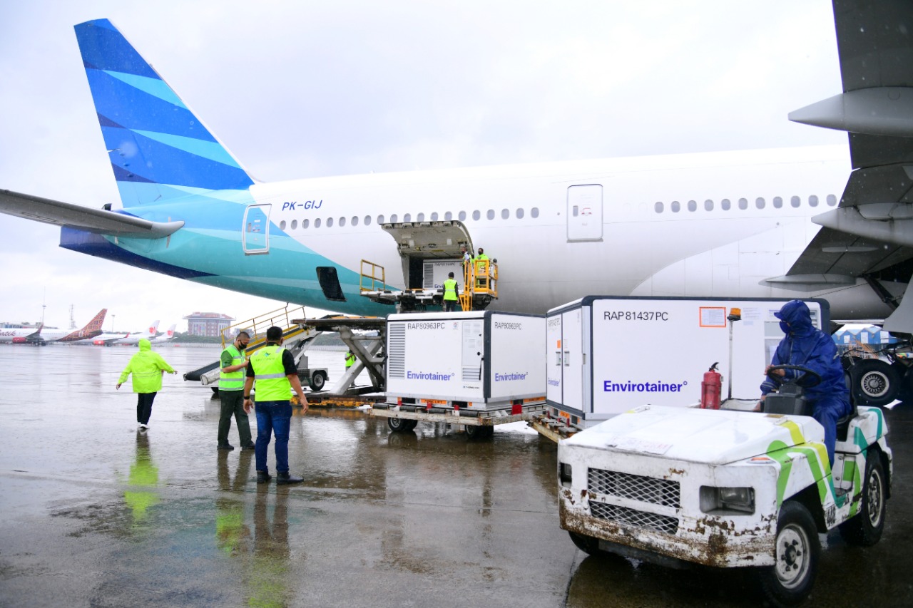 Setibanya di Bandara Soekarno-Hatta, vaksin kemudian dibawa ke _warehouse_ Garuda Indonesia terlebih dahulu untuk dilakukan pengisian ulang daya Envirotainer. Rencananya, vaksin akan langsung dibawa untuk disimpan di Kantor Pusat Bio Farma di Bandung.