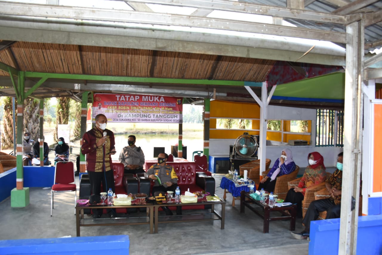 Dalam sambutannya, Plh. Bupati menyampaikan atas nama Pemkab Sergai, dirinya mengucapkan terima kasih kepada Kapolres Sergai yang telah sangat peduli terhadap proses percepatan penanganan Covid-19, salah satunya dengan membentuk Kampung Tangguh ini.
