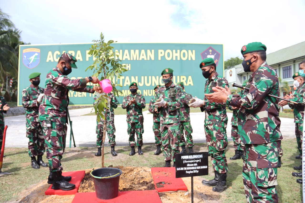 Usai memberikan pengarahan kepada para perwira, Pangdam XII/Tpr, Mayjen TNI Muhammad Nur Rahmad serta PJU Kodam XII/Tpr memberikan bantuan berupa APD kepada Satgas Covid-19 Rindam XII/Tpr, dilanjutkan melaksanakan penanaman pohon buah di areal Makorindam XII/Tpr. (Pendam XII/Tpr)