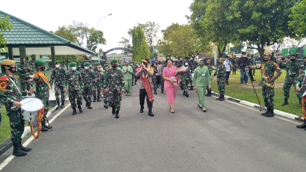 Pangdam I/BB Mayjen TNI Hasanuddin bersama Ketua Persit KCK PD I/BB Dessy Hasanuddin menyambut langsung kedatangan Kapolda Sumut dan Ketua Bhayangkari bersama seluruh PJU Poldasu.