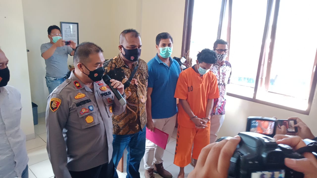 Kapolresta Pekanbaru Kombes Pol H.Nandang Mu'min Wijaya., S.I.K., M.H melalui Kapolsek Rumbai Pesisir Kompol Maitertikan, S.H, didampingi Kanit Reskrim dalam Konferensi Persnya di Mapolsek Rumbai Pesisir, tersangka tindak pidana KDRT yang kita amankan berinisial RR alias Eki (25), suami dari korban AM alias Putri (23), warga Jalan Yos Sudarso Kelurahan Meranti Pandak Kecamatan Rumbai Pesisir Pekanbaru, Jumat (19/3/2021) pagi.