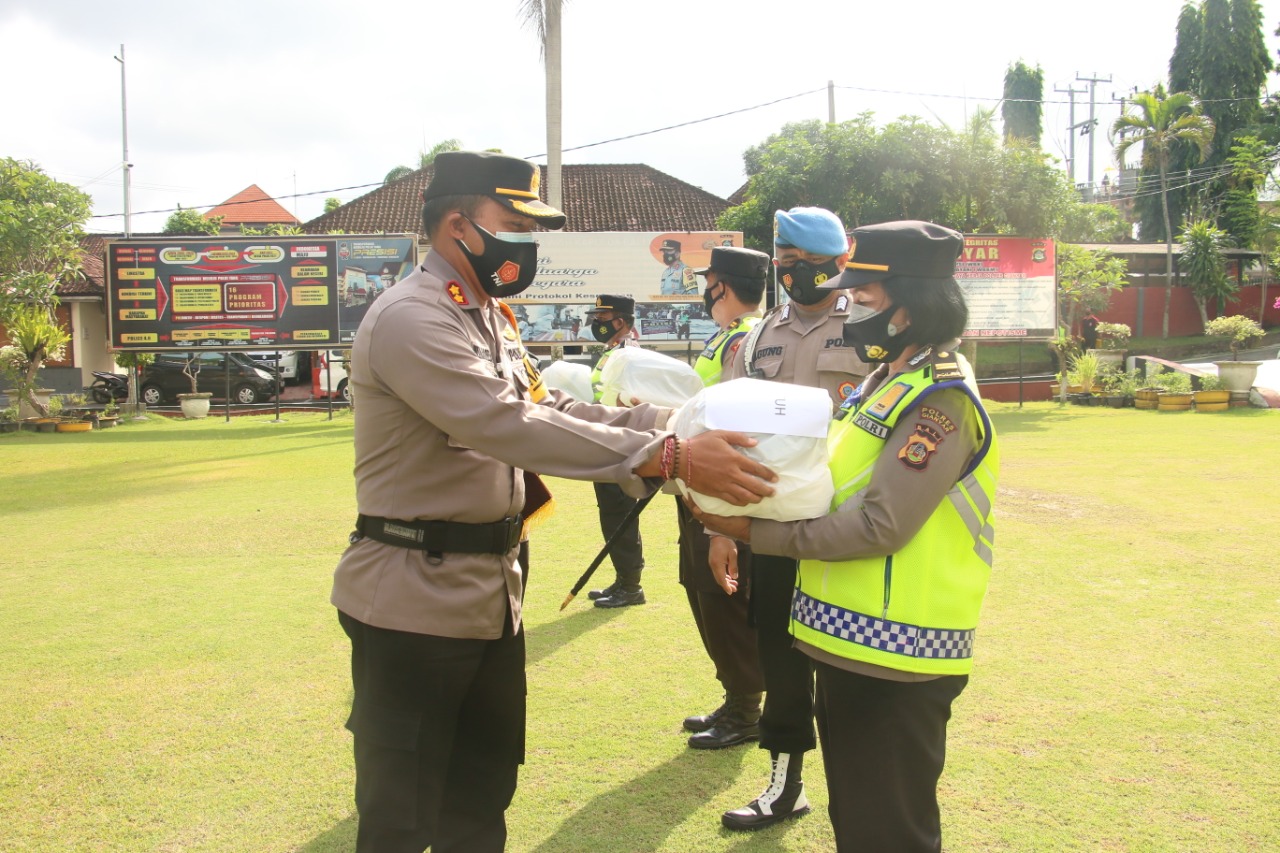 Kapolres Gianyar AKBP I Dewa Made Adnyana, S.I.K., S.H., MH. Gelar apel pendistribusian masker dari Kementerian Perindustrian RI kepada masyarakat Kabupaten Gianyar bertempat di Lapangan Apel Endra Dharmalaksana Polres Gianyar.