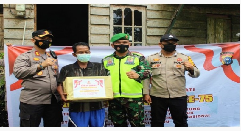 Kapolres Bengkalis AKBP Hendra Gunawan, SIK.MT Pimpin langsung dalam pembagian paket sembako yang di dampingi Waka Polres Kompol Aslely Farida Turnip, SIK, para Kabag, Para Kasat, Babinkamtibmas serta Personil Kodim 0303/Bengkalis dalam kegiatan Bakti Sosial menyambut Hari Ulang Tahun Bhayangkara ke-75.