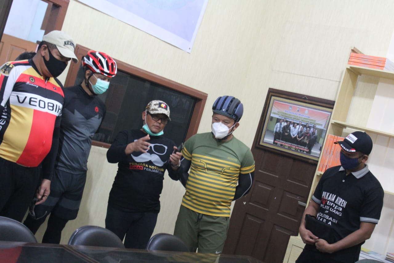 "Pagi ini kita akan bersepeda bersama dengan Ketua Bawaslu Riau ke Danau Buatan Rumbai dengan jarak tempuh sekitar 20 Km." tuturnya kepada seluruh pesepeda yang hadir.