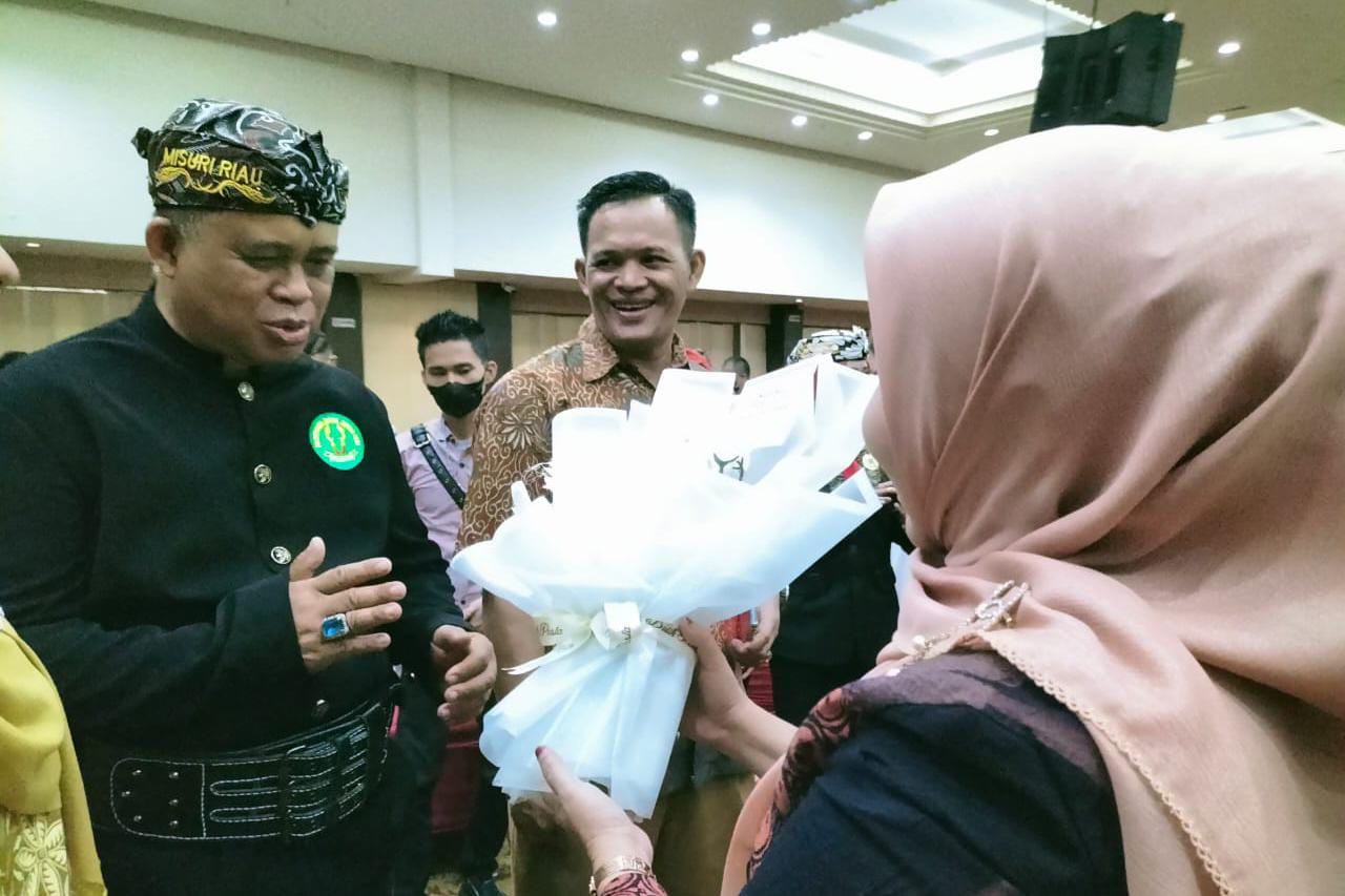 Foto: Anggota DPRD Kota Pekanbaru, dari Fraksi Golkar, Ida Yulita Susanti, S.H,.M.H saat menerima cindermata dari Ketua Organisasi Paguyuban Misuri, Eyang Surachmad, pada acara pelantikan pengurus DPP Misuri, Minggu, 19/06/2022