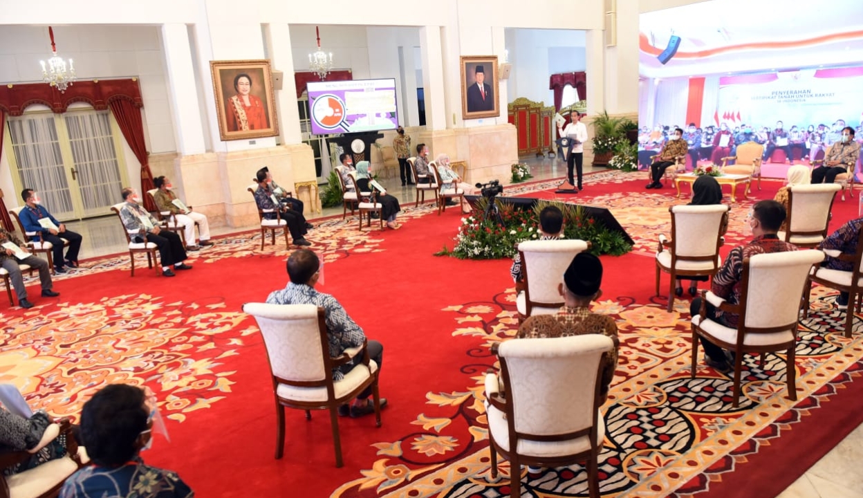 Sementara, untuk penyerahan sertifikat tanah di Istana Negara dihadiri oleh 30 orang penerima sertifikat tanah yang mewakili satu juta penerima sertifikat tanah di seluruh Indonesia yang hadir dengan tetap memperhatikan protokol kesehatan Covid-19 yang ketat.