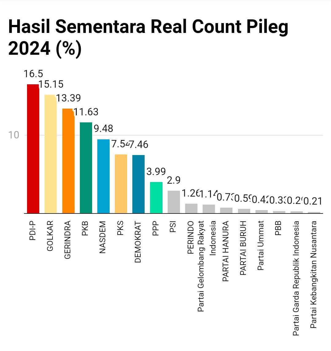 Dari 18 parpol nasional, Perjuangan (PDIP) masih unggul di perhitungan asli data TPS atau real count dengan perolehan 16,5% atau 12.554.383 suara. Di bawah PDIP terdapat Golkar dengan perolehan suara 15,15% atau 11.530.240 suara.