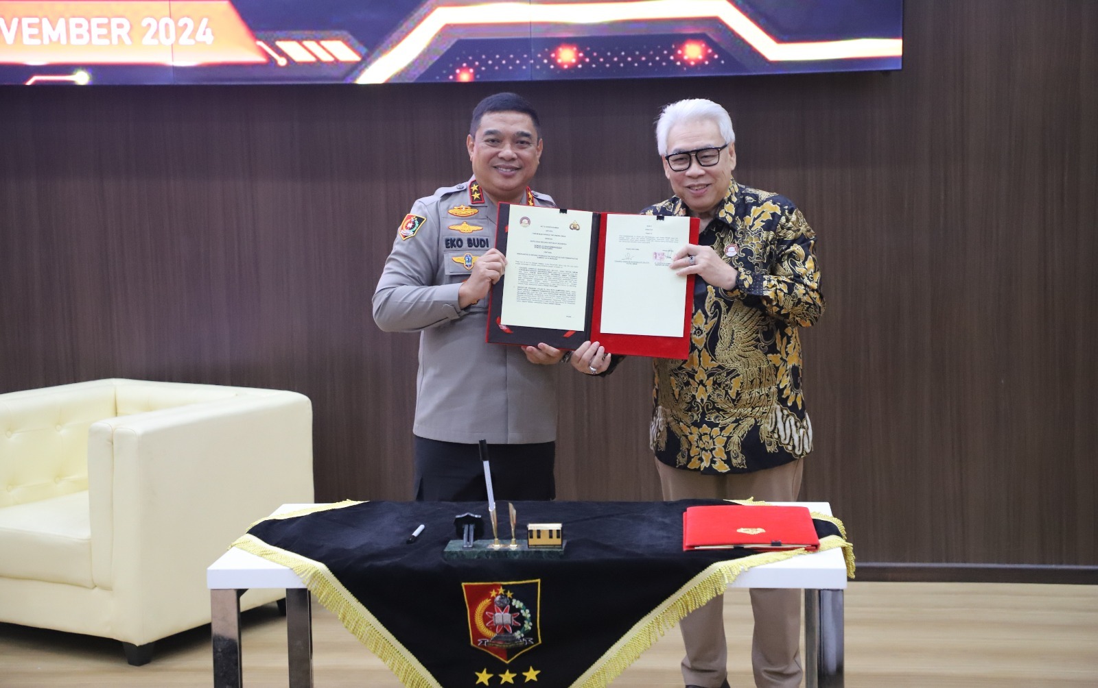 AKTUALDETIK.COM - Forum Masyarakat Indonesia Emas (FORMAS) dibawah kepemimpinan Ketua Umum, Yohanes Handoyo Budhisejati dan Dewan pembina, Hashim Djojohadikusumo, hari ini, jum'at, 8 November 2024 resmi tandatangani MoU dengan wakil kepala Lemdiklat Polri, Irjen Pol. Eko. Kabarnya, kesepakatan ini akan diwujudkan dalam bentuk kerjasama bidang Sumber daya manusia. 8/11/2024.