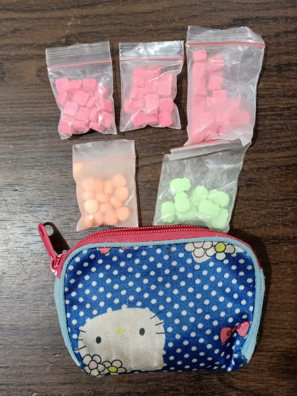 Sementara dari tersangka EN alias Susan disita satu plastik bening berisikan serbuk Pil Ekstasi warna orange, sebuah dompet bergambar Hello Kitty warna biru merah berisikan sebungkus plastik bening berisikan 9 butir Pil Ekstasi Merk Hulk Warna Hijau, sebungkus plastik bening berisikan 29 butir Pil Ekstasi Merk Instagram warna pink, sebungkus plastik bening berisikan 25 butir Pil Ekstasi Merk Instagram Warna Pink.