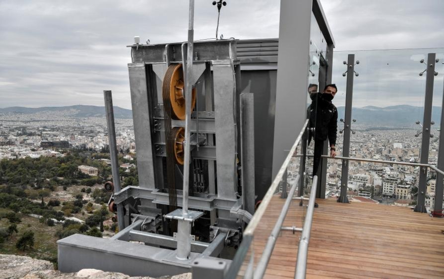 Lift baru terlihat di Acropolis di Athena, Yunani, pada 3 Desember 2020. Perdana Menteri Yunani Kyriakos Mitsotakis pada hari Kamis meresmikan lift baru yang dipasang di lereng bukit Acropolis yang terkenal dan jalur yang dirancang khusus untuk membuat 2.500 tahun monumen tua lebih mudah diakses oleh penyandang cacat dan orang tua.