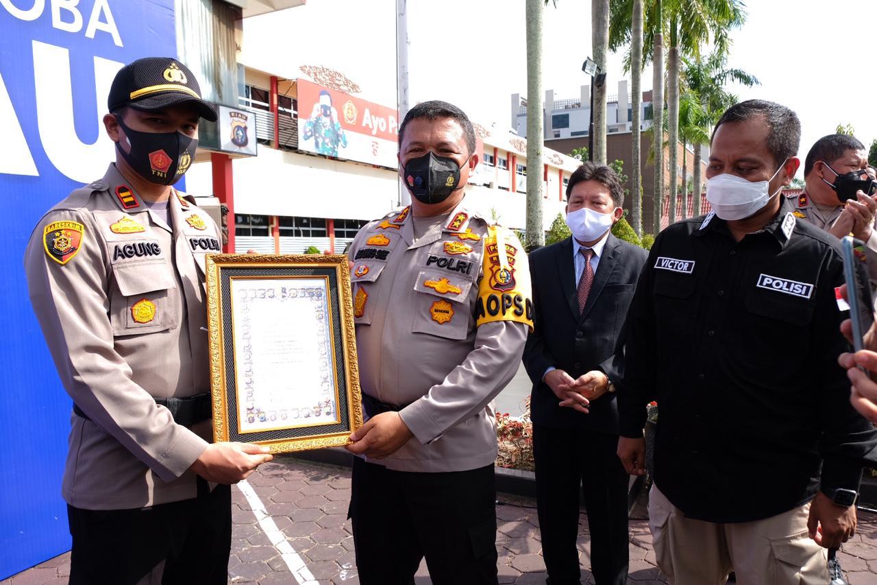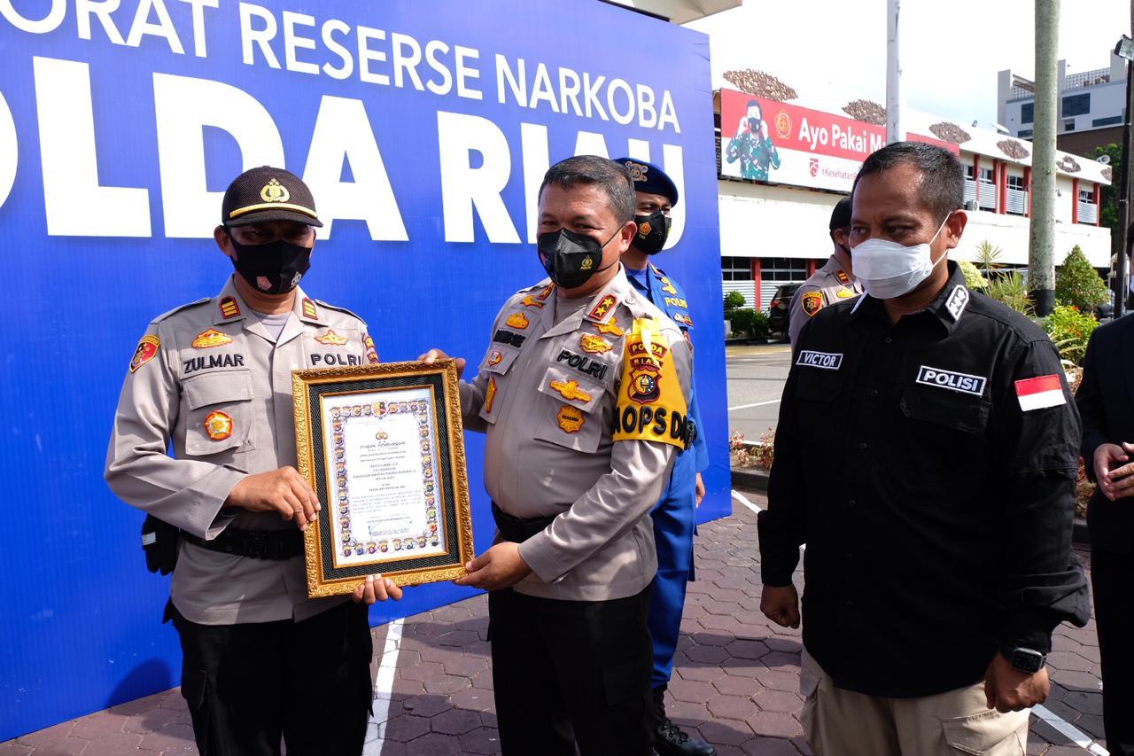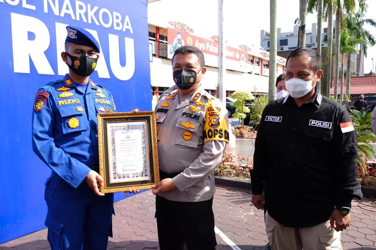 Kapolda Riau Irjen Agung Setia menyerahkan secara langsung penghargaan tersebut disaksikan oleh Wakapolda, Dir Resnarkoba, Kabid Humas dan Ketua Lemkapi DR Edy Hasibuan SH MH di lapangan apel Mapolda Riau.