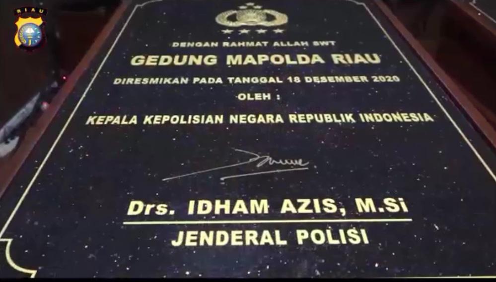 Kapolri Jenderal Idham Azis lewat tayangan video usai menanda tangani prasasti berpesan, dengan adanya bangunan dan fasilitas yang baru dapat menjadi momentum bagi anggota jajaran Polda Riau, guna memacu semangat dan motivasi dalam melanjutkan pengabdian terbaik kepada masyarakat, bangsa, dan negara.