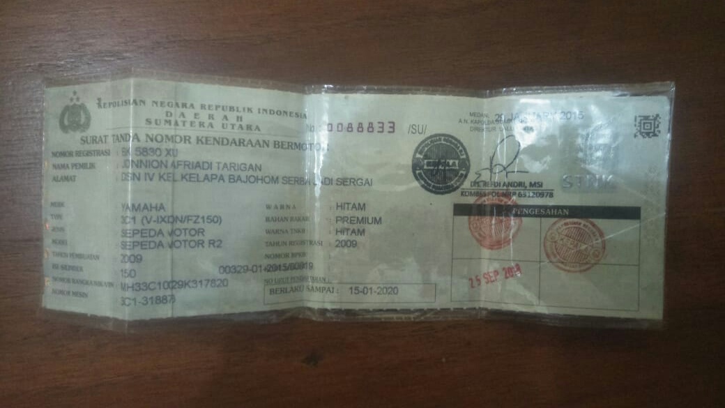 Selanjutnya, sambung kapolres, tersangka yang juga warga yang sama dengan korban diamankan dengan barang bukti, 1 lembar STNK Sp. Motor Yamaha Vixion An. Jonnion Afriandi Tarigan Nopol BK 5830 XU No Rangka MH33C10029K317820 No. Mesin 3c1-318873, 1 BPKB asli An. Jonnion Afriandi Tarigan BK 5830 XU No Rangka MH33C10029K317829 No Mesin 31C-318873 dan uang sisa penjualan sepeda motor Yamaha Vixion Rp1.8 juta.