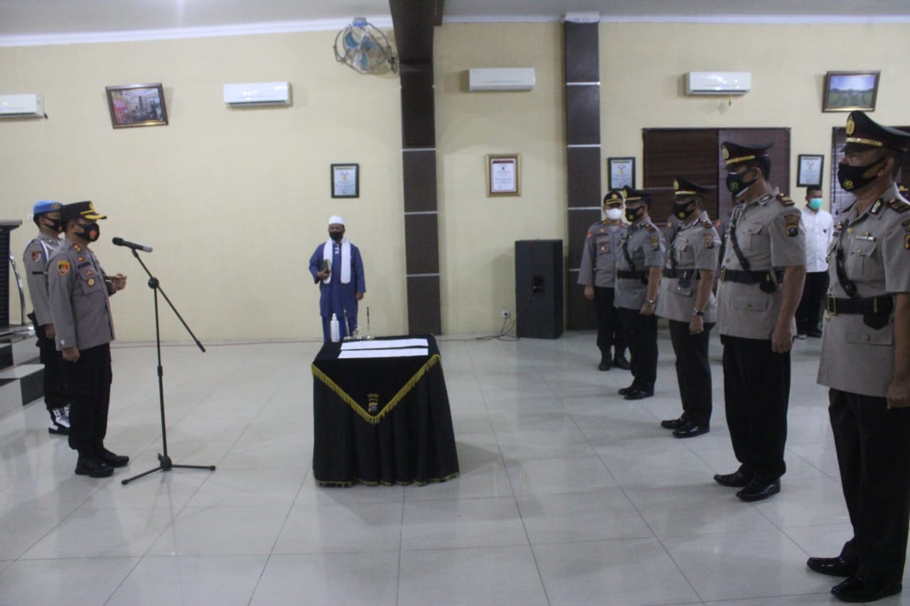 Upacara Sertijab dilaksanakan di Aula Patriatama, Rabu (29/12/2020) pagi dengan dihadiri PJU, Kasatfung, Perwira, Bintara dan Kapolsek yang dilantik.