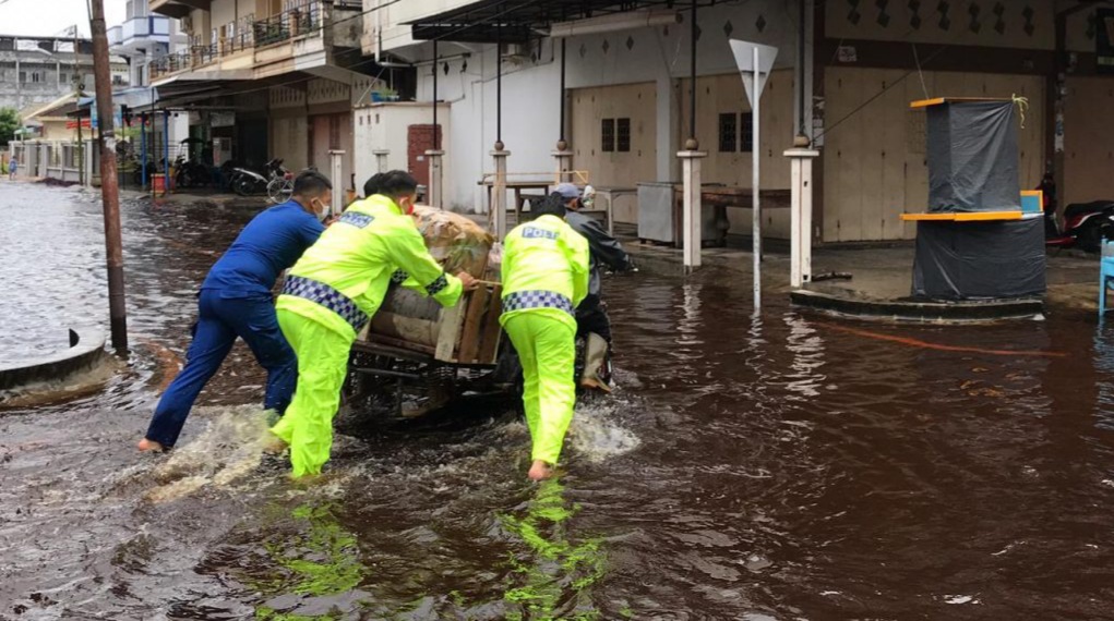 Terlihat dilapangan, Polres Meranti yang dipimpin langsung Kapolres Meranti bersama BPBD Meranti, Banser Kepulauan Meranti dan masyarakat setempat langsung turun ke jalan melaksanakan pengecekan terhadap titik-titik banjir di kota Selatpanjang. Minggu (10/01/2021).