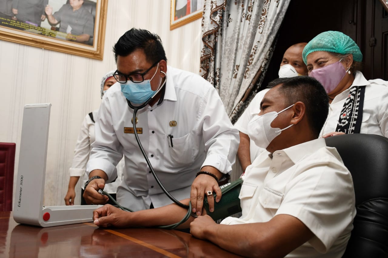 H Darma Wijaya yang juga Wakil Bupati Sergai Sebelum dilakukan vaksinasi terlebih dahulu petugas melakukan pemeriksaan tekanan darah untuk memastikan kondisi tubuh dalam keadaan normal.