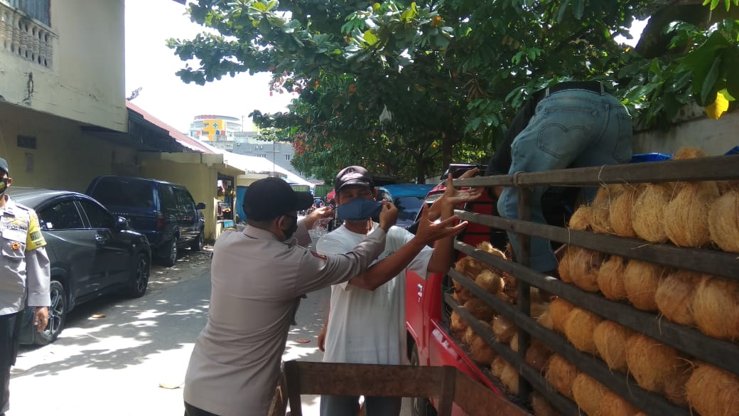 Polsek Bukit Raya, laksanakan kegiatan Pembagian masker dan mengimbau para pedagang dan pengunjung Pasar Pagi Dupa