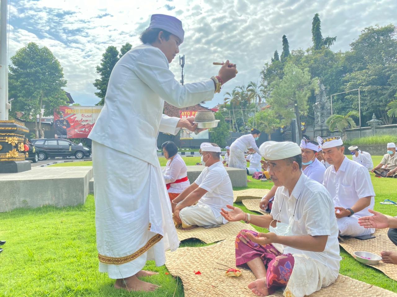 BALI AKTUALDETIK.COM - Dalam Rangka Peringati Hari Tumpek Landep yang jatuh pada Saniscara Kliwon Wuku Landep, Kapolres Klungkung AKBP Bima Aria Viyasa, S.I.K.,M.H., didampingi Wakapolres Klungkung Kompol Luh Ketut Amy Ramayathi Prakasa, S.I.P., M.M., bersama dengan Para Pejabat Utama Polres Klungkung beserta Personel dan Asn Polres Klungkung melaksanakan persembahyangan bersama di Halaman Polres Klungkung namun tetap memperhatikan protokol kesehatan, Sabtu, 13/02/2021