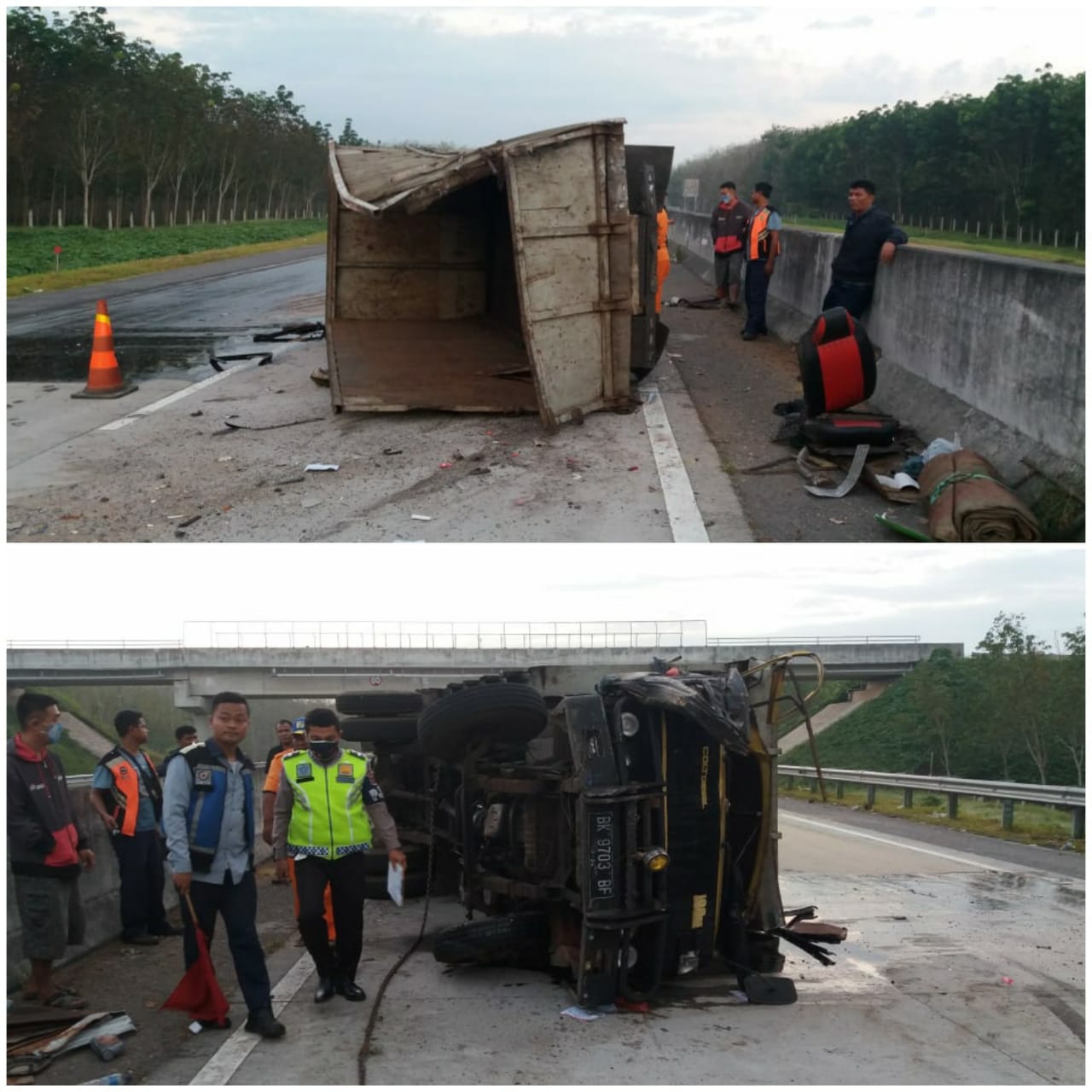 Kapolres Serdang Bedagai AKBP Robin Simatupang SH MHum didampingi Kasat Lantas AKP Agung Basuni SH SIK kepada wartawan mengatakan bahwa setelah tabrakan mobil truk Colt diesel terguling di atas badan jalan di jalur cepat.