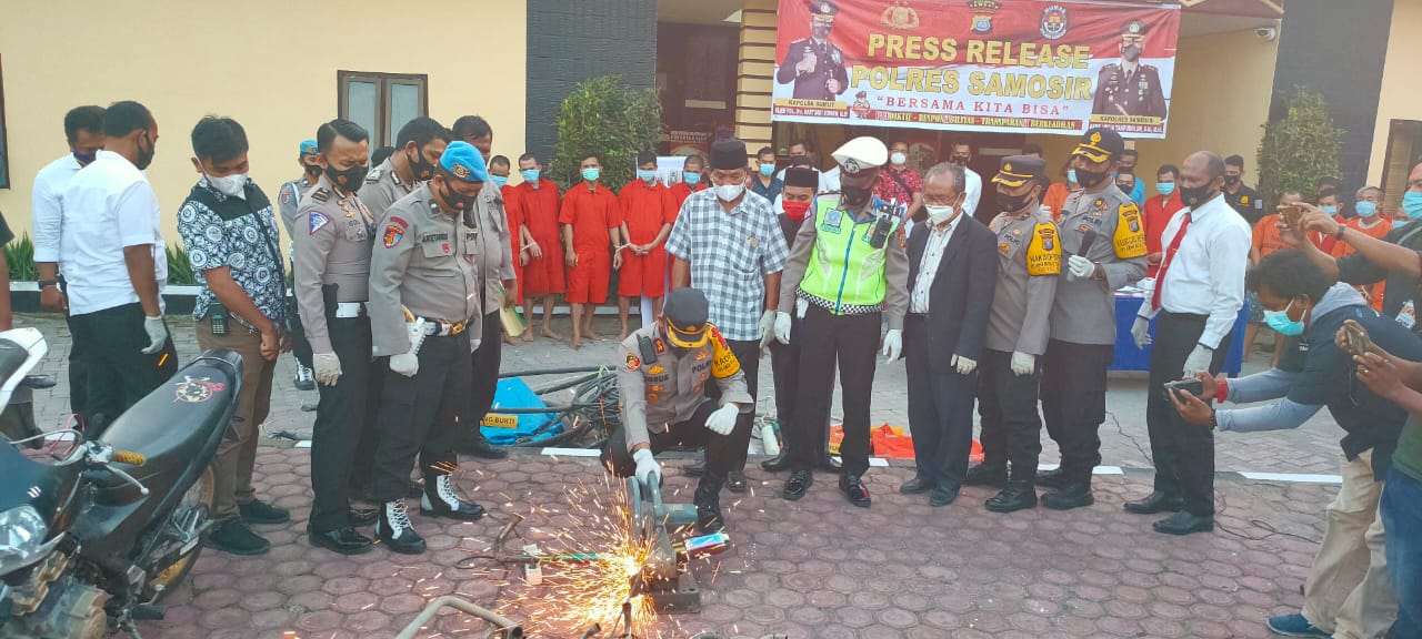 SAMOSIR AKTUALDETIK.COM - Polres Samosir mengungkap 8 kasus kejahatan dengan mengamankan 17 tersangka selama Januari-Februari 2021. Mereka merupakan pelaku kejahatan Curat, narkoba, perjudian dan penertiban knalpot blong