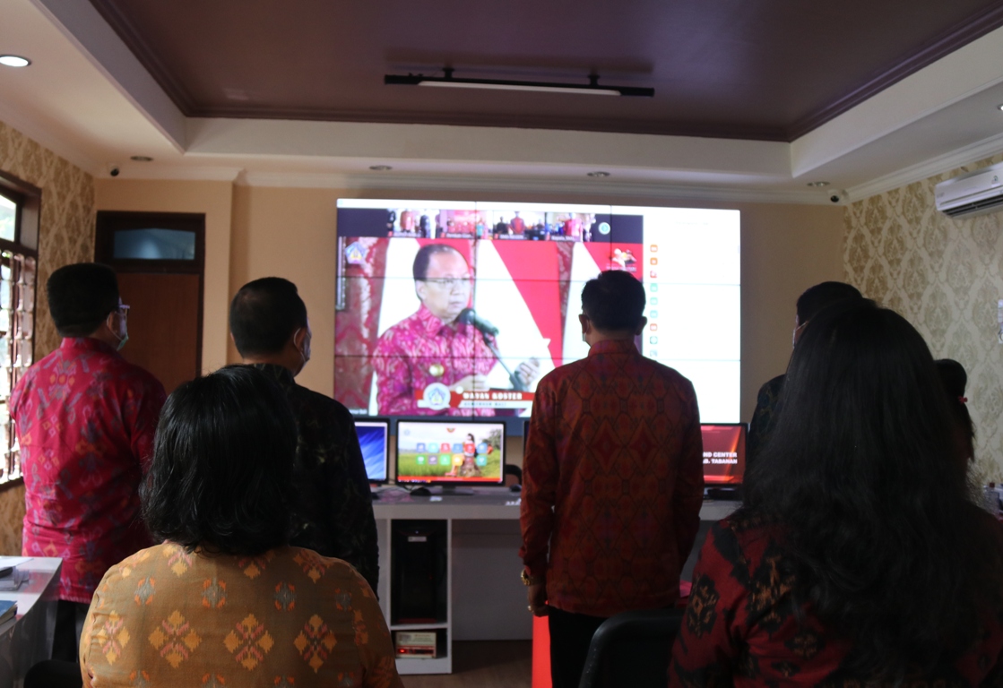 BALI AKTUALDETIK.COM - Plh.Bupati Tabanan I Gede Susila, mengikuti kegiatan peresmian penggunaan kain tenun endek/kain tenun tradisional Bali yang dilaksanakan secara virtual melalui aplikasi zoom meeting, Selasa (23/2).