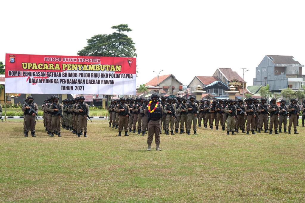 Upacara Penyambutan Brimob Nusantara BKO Polda Papua Tahun 2021 Personel Brimob Polda Riau, bertempat di Halaman Mapolda Riau Jl.Pattimura no 13 Pekanbaru pada Kamis (25/2/2021)