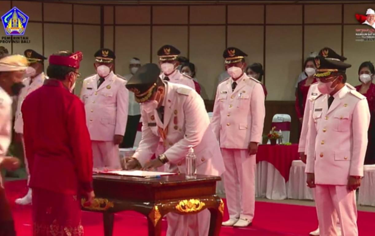 Pelantikan tersebut dilakukan serentak bersama lima Kepala Daerah di lima Kabupaten/Kota di Bali, yakni Denpasar, Badung, Karangasem, Negara serta Bangli, oleh Gubernur Bali I Wayan Koster di Gedung Wiswa Sabha Utama Kantor Gubernur Bali, yang juga disiarkan live secara virtual, Jumat (26/2).