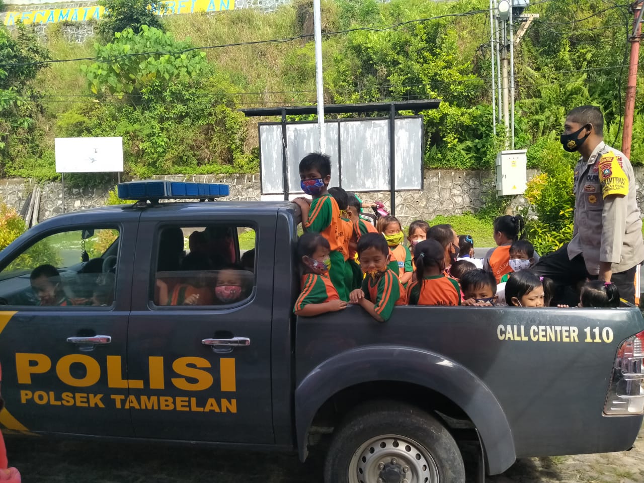 Setibanya di Mapolsek, murid-murid tersebut langsung diajak mengenal barang-barang atau peralatan dinas Kepolisian dan kegunaannya kepada murid-murid mulai dari senjata api organik Polri berupa Revolver, SV2, rompi anti peluru, borgol, helm, kendaraan dinas baik roda 2 maupun roda 4 patroli yang dijelaskan langsung oleh personil Polsek Tambelan.