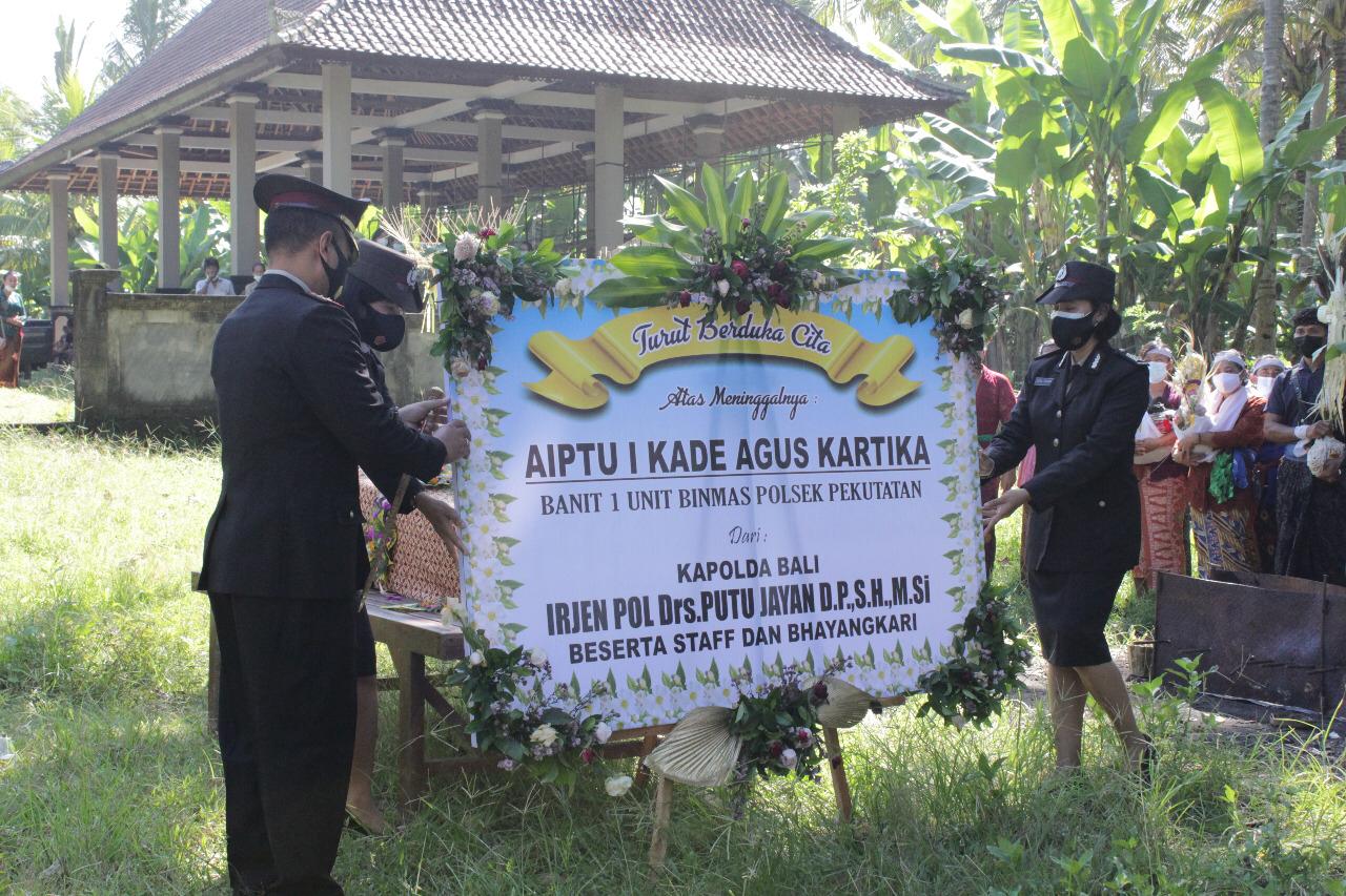 Kapolres Jembrana AKBP l Ketut Adi Wibawa ,S.I.K selaku lrup memimpin upacara perabuan jenazah Aiptu l Kade Agus Kartika bertempat di Kuburan Br. Yeh Kuning, Ds./Kec. Pekutatan, Kab. Jembrana