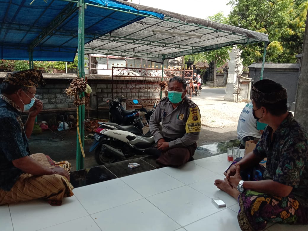 Kehadiran Polsek Gianyar memberikan edukasi tentang Protokol Kesehatan diterima oleh Kelian Adat Banjar Tegal I Made Ardana dan oleh semua Masyarakat Adat / Krama Adat yang hadir pada ngayah.