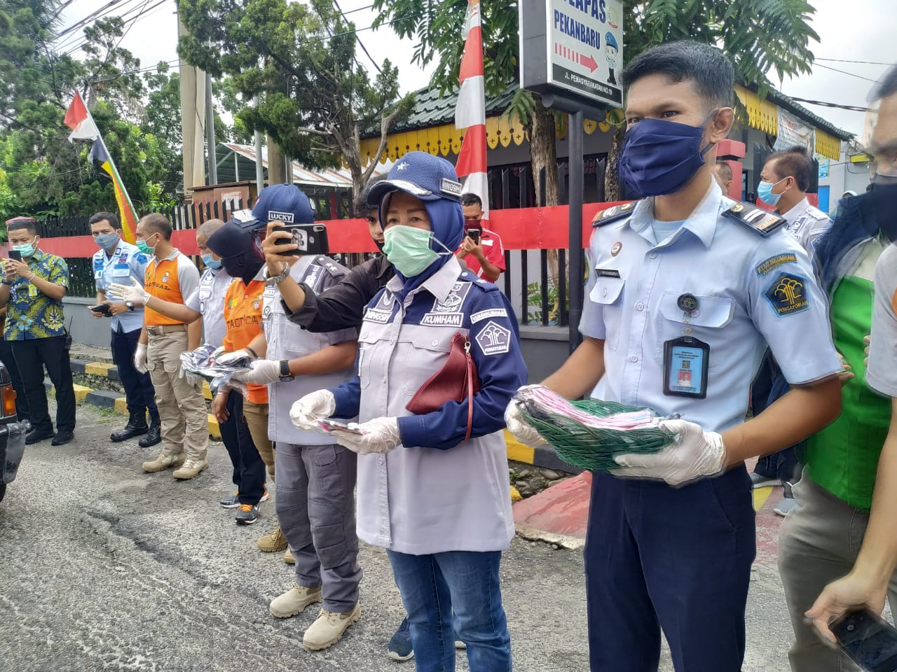 Pembagian sembako kali ini dilakukan untuk 30 orang warga masyarakat terdampak Covid - 19, terdiri dari masyarakat lokal, dan sejumlah Napi asimilasi yang sangat membutuhkan bantuan. Sementara itu, pembagian topeng dibagi dua buah langsung dibagikan oleh Kepala Kantor Wilayah Riau, Lucky Agung bersama Kepala Divisi Lembaga Pemasyarakatan (Kadiv Pas) dan pejabat lainya di Jalan Kavling Kec. Berlayar Gobah.