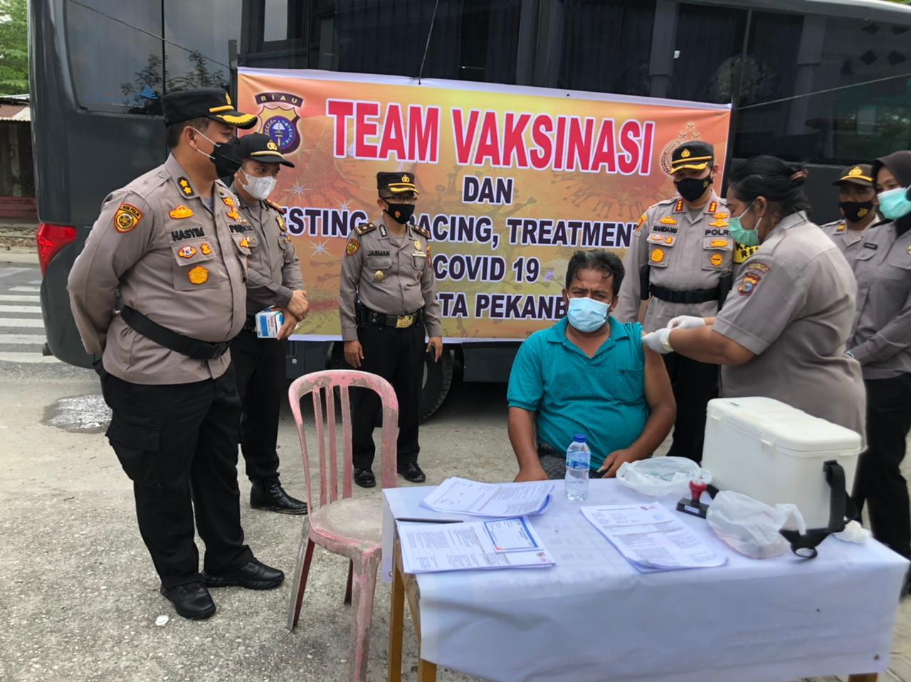 Kapolresta Pekanbaru membawa petugas medis (Vaksinator) agar masyarakat bisa divaksin gratis. Cara ini pun disambut antusias warga masyarakat, karena dirasa lebih praktis dan tak perlu repot datang ke tempat vaksin.