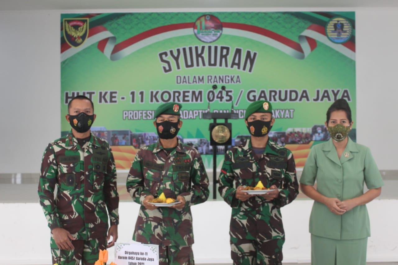 Penrem 045/Garuda Jaya. Syukuran HUT Korem 045 Garuda Jaya yang ke-11 dilaksanakan dengan sederhana namun penuh makna dan kekeluargaan yang diadakan di Aula Makorem Selasa 15/06/2021