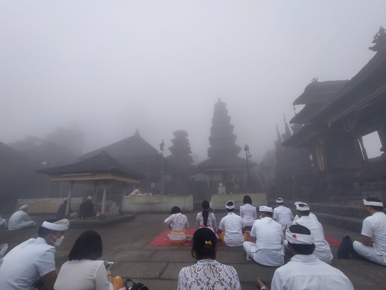 rombongan melaksanakan persembahyangan di Pura Kahyangan Jagat Pura Pasar Agung Giori Tohlangkir, Selat Karangasem.