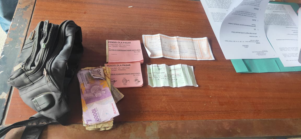 Dari kejadian tersebut, barang bukti yang berhasil diamankan dari pelaku AP dan DR berupa 1 block karcis bertuliskan "Retribusi kebersihan pasar karya baru" kemudian sebanyak 39 lembar karcis bertuliskan "Retribusi keamanan pasar karya baru", uang tunai sebesar Rp. 452.500 dan 1 buah tas Polo.
