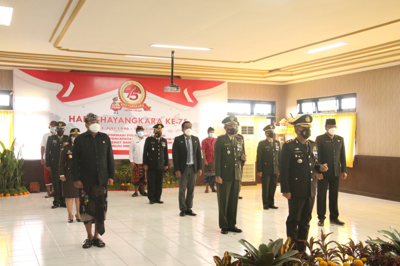 Menurut keterangan Kapolres Gianyar AKBP l Made Bayu Sutha Sartana ,S.I.K.,M.H, bahwa Upacara Hari Bhayangkara ke-75 dilaksanakan secara virtual yang dipimpin langsung oleh Presiden Republik Indonesia selaku inspektur upacara, kemudian dilanjutkan dengan acara syukuran.