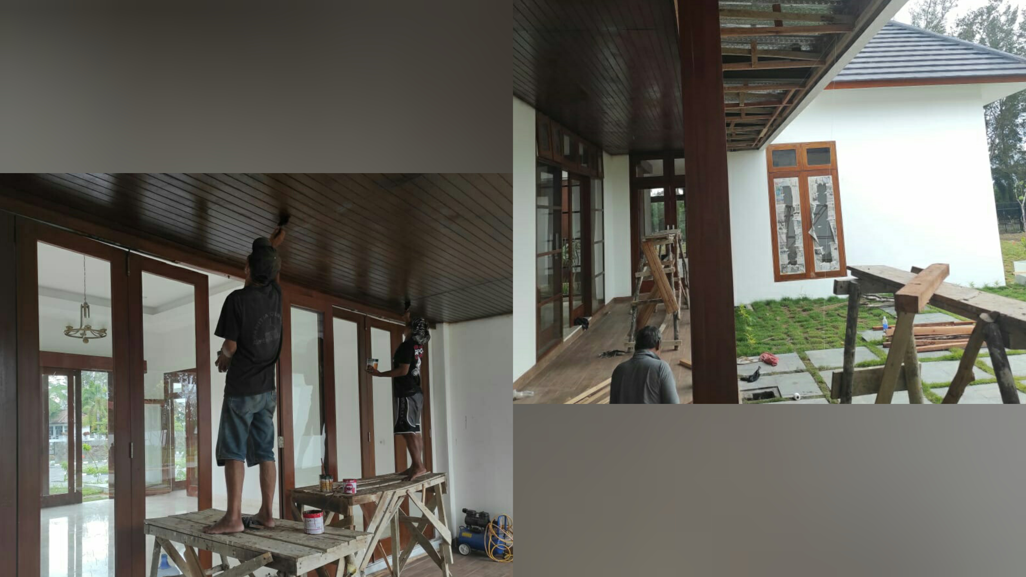 Pantauan Pers Babel saat itu terlihat beberapa pekerja/buruh bangunan sedang bekerja melakukan pemasangan plafon kayu pada teras belakang. Dan sebagiannya sedang berkerja pada bangunan pendopo yang terletak pada halaman belakang rumah.