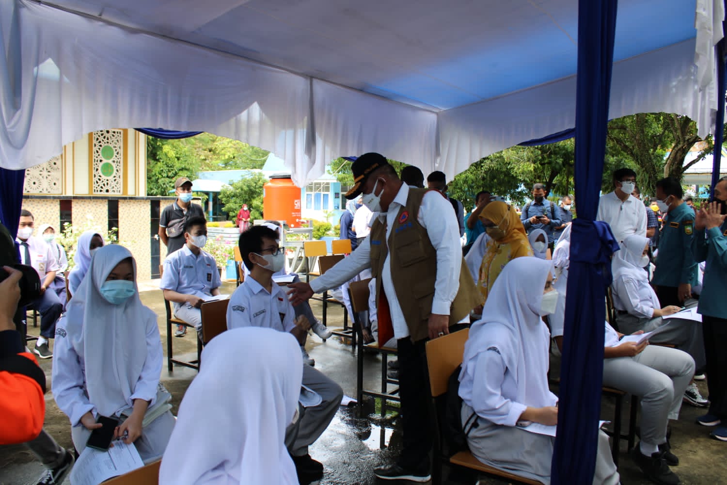 Rombongan diawali mendatangi tempat sekolah yang sedang melaksanakan kegiatan Vaksinasi Covid-19 Tahap I dan II bagi Pelajar SMP/SMA Pekanbaru bertempat di SMA Negeri 8 Pekanbaru di jalan Abdul Muis Kel Cinta Raja Kec Sail Pekanbaru disambut oleh Kadis Kesehatan Prop Riau Hj Mimi Yuliani Nazir Apt.M.M didampingi oleh Kepala Sekolah SMA N 8 Pekanbaru Bpk Tavip dan dilanjutkan Penyerahan bantuan dari kepala BNPB RI.