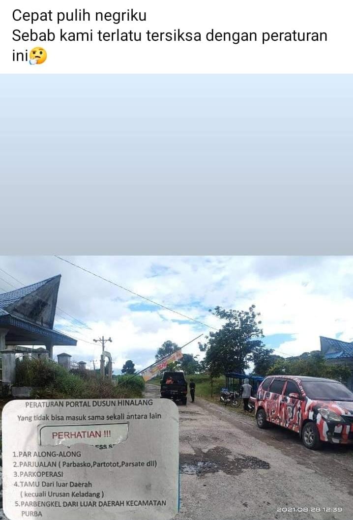 "Kami masyarakat di Desa Hinalang sangat tertekan dikarenakan peraturan pangulu Hinalang. Peraturan yang diperbuat pangulu Hinalang bunyi nya ialah "Jika siapa tidak mau menjaga portal, maka akan di usir dari desa hinalang ini" Kata Pangulu kepada kami. Karena mengingat pesan peraturan Walnayan Purba Pangulu Hinalang. Maka saya terpaksa mengeluarkan uang Rp. 700.000; (Tujuh Ratus Ribu Rupiah) untuk upah pengganti saya menjaga di portal. Saya tidak bisa ikut jaga portal dikarenakan saya sakit dan berobat ke laboratorium di Saribudolok, karena tidak ada perobahan penyakit saya, kemudian saya di bawa berobat ke Pematang Siantar selama seminggu, kami sebagai masyarakat bingung melihat kepemimpinan pemerintahannya di Simalungun ini Terkhusus di Nagori Hinalang ini." Tutur warga hinalang pada kru media ini hari Rabu, pukul 13.24 wib, via phone/WhatsApp-nya.