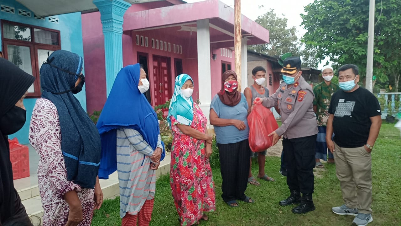 Foto Kapolsek Tanah Jawa Kompol Selamat Manalu saat memberikan bantuan sembako kepada masyarakat yang terkena bencana alam Angin puting beliung