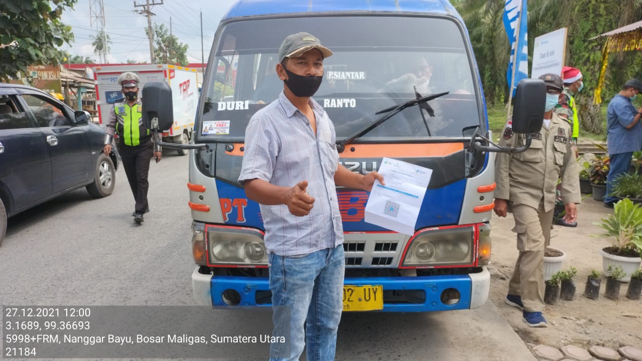 SIMALUNGUN - Dipimpin langsung Kepala Satuan Reserse (Kasatres) Narkoba Polres Simalungun AKP Adi Haryono SH melaksanakan pemeriksaan air seni atau test urine terhadap supir angkutan umum atau bus Antar Kota Antar Provinsi (AKAP) yang melintas di Jalan Lintas Siantar-Perdagangan Kabupaten Simalungun tepatnya Pos Pengamanan (Pospam) Operasi Lilin Toba 2021 Parlanaan, Senin (27/12/2021) siang sekira pukul 11.50 WIB.