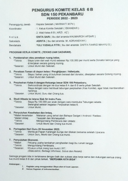 PEKANBARU, AKTUALDETIK.COM - Komite SDN 150 Pekanbaru telah menerbitkan Surat Program Kerja Komite yang tertulis sebagai penanggung jawab adalah Kepala Sekolah dan berisi tujuh poin terdiri dari beragam kegiatan yang beberapa diduga adanya pungutan iuran kepada orangtua murid, Selasa (8/11/2022).